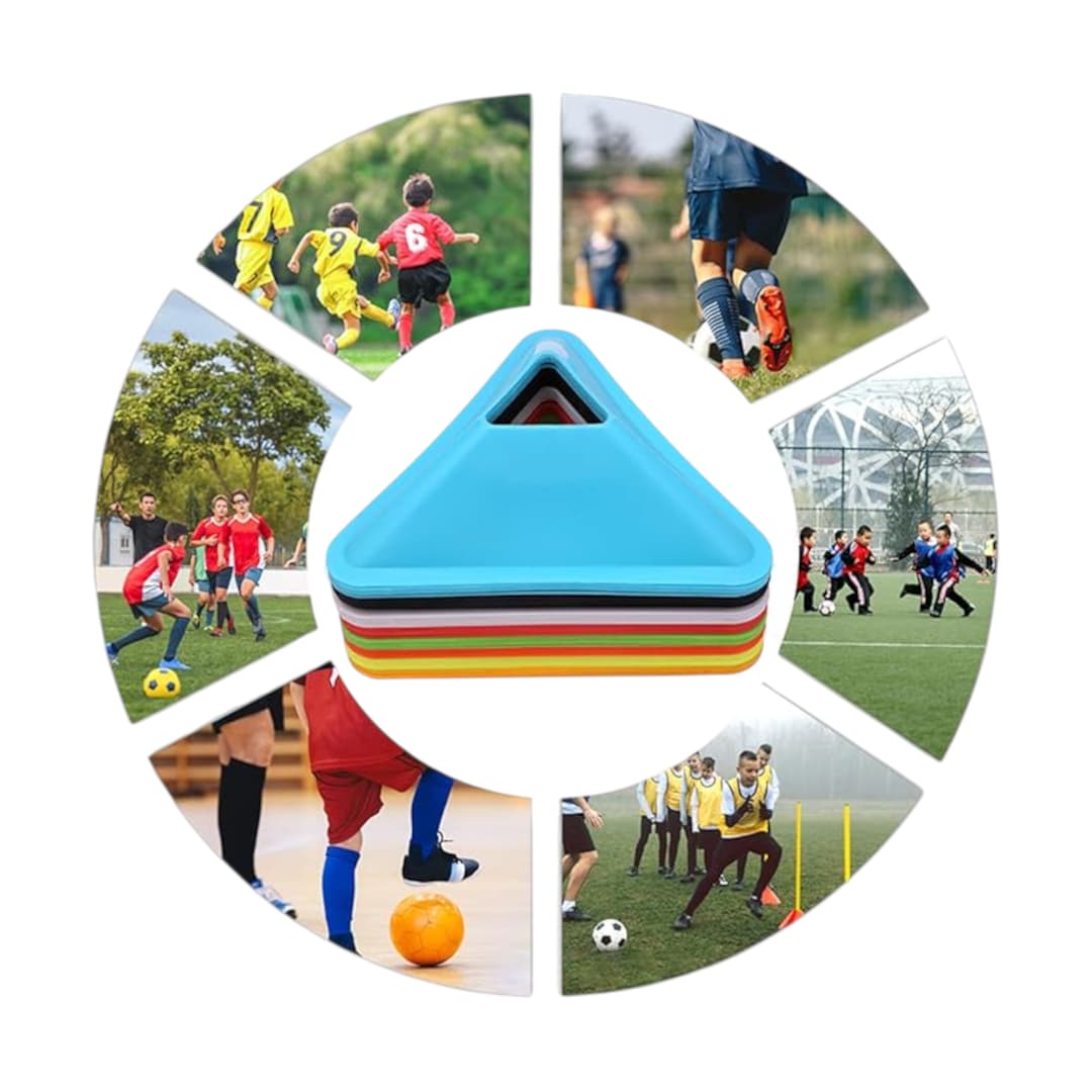 El Pack de 50 Conos Lenteja Triángulo es perfecto para todo tipo de entrenamientos deportivos. Su diseño en forma de triángulo mejora la estabilidad y la visibilidad en el campo, haciendo más eficientes las prácticas de velocidad, agilidad, coordinación y técnica. Fabricados con material flexible y resistente, son ideales tanto para deportes colectivos como individuales, y aptos para uso en interiores o exteriores.